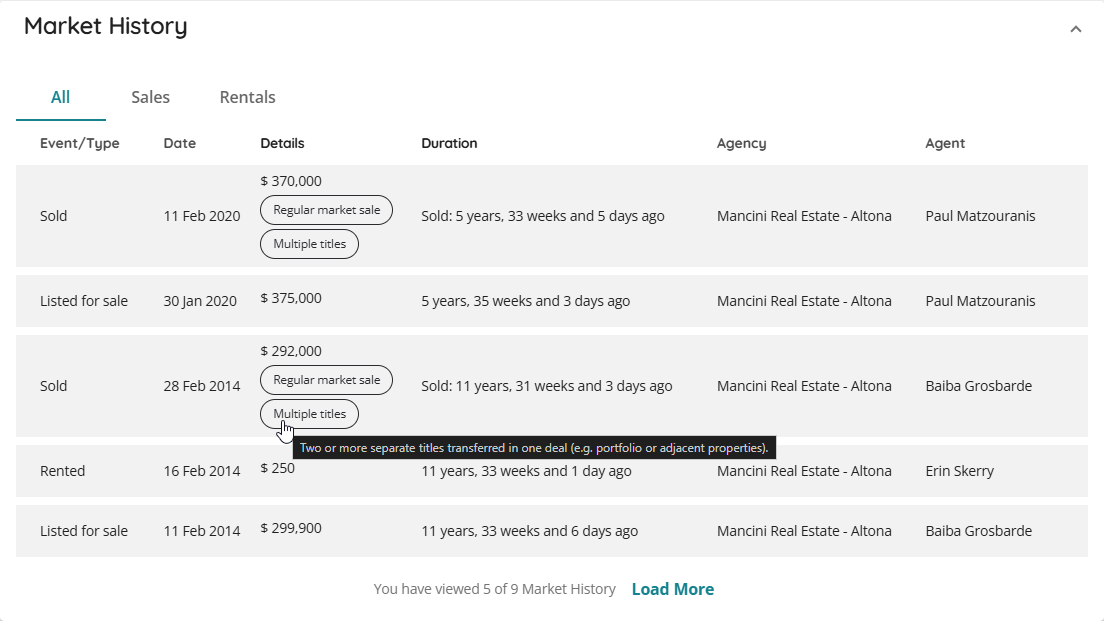 Adds sale event flags to AU Market History, enabling users to instantly identify key details about settled property sales—such as regular market versus non-arm’s length deals, partial or full ownership transfers, and single or multi-title transactions.
