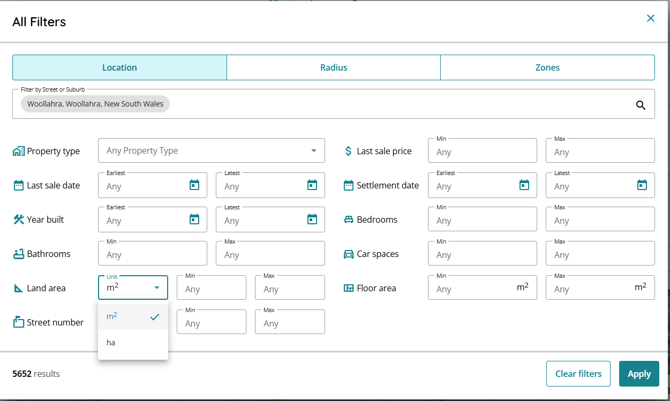 - Introduced a unit selector (m² / hectares) to the Land Area filter so users can search using the unit they’re most familiar with.
